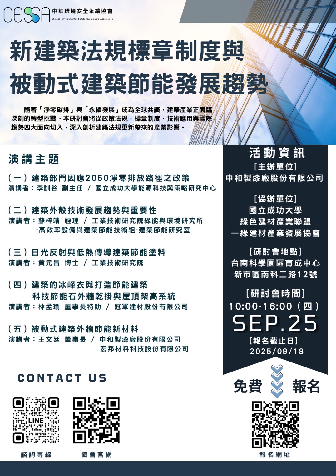 舉辦時間:2025年9月25號(四)10:00-16:00 舉辦地點:台南科學園區育成中心 (台南市新市區南科二路12號) 報名方式: 掃描QR code線上報名 主辦單位: 中和製漆廠股份有限公司 協辦單位: 台灣綠建材產業發展協會、國立成功大學、綠色建材產業聯盟等